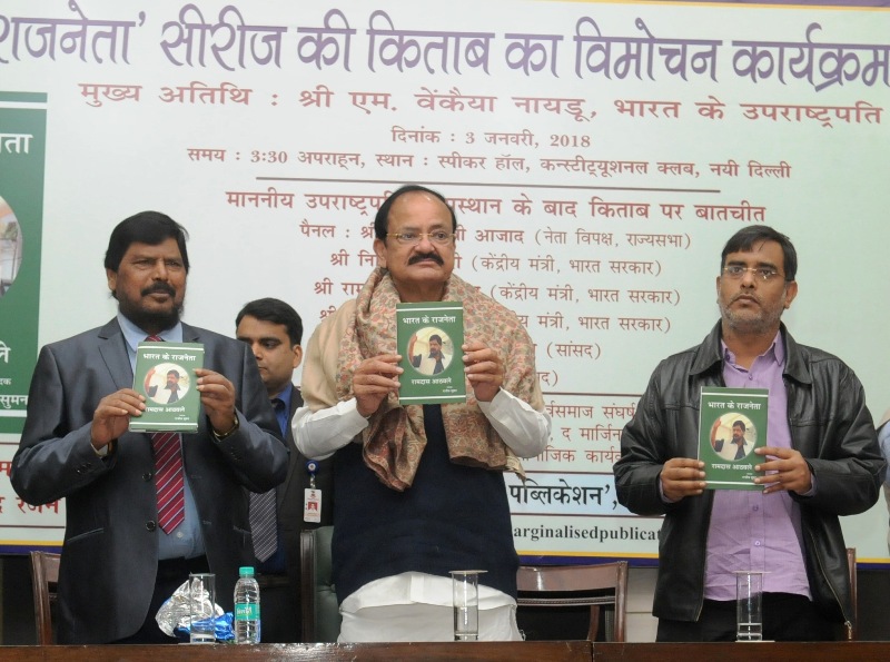 The Vice President, M. Venkaiah Naidu releasing the book “Bharat Ke Rajneta - Ramdas Athawale â€, authored by Shri Rajeev Suman, in New Delhi on January 03, 2018. The Minister of State for Social Justice & Empowerment, Shri Ramdas Athawale is also seen.