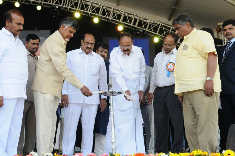 The Vice President, M. Venkaiah Naidu lighting the lamp at the Golden Jubilee Celebrations of Jagarlamudi Kuppuswamy Choudhary College, in Guntur, Andhra Pradesh on February 03, 2018. The Chief Minister of Andhra Pradesh, N. Chandrababu Naidu and other dignitaries are also seen.