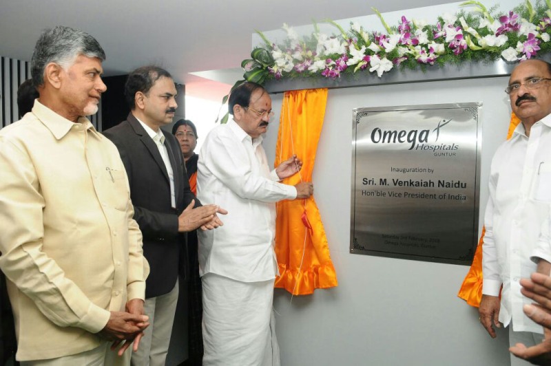 The Vice President, M. Venkaiah Naidu inaugurating the Omega Hospitals, in Guntur, Andhra Pradesh on February 03, 2018. The Chief Minister of Andhra Pradesh, N. Chandrababu Naidu and the Minister for Health and Medical Education, Andhra Pradesh, Dr. Kamineni Sreenivas are also seen.