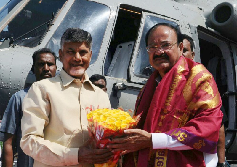 The Vice President, M. Venkaiah Naidu being received by the Chief Minister of Andhra Pradesh, N. Chandrababu Naidu, on his arrival, in Guntur, Andhra Pradesh on February 03, 2018.
