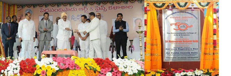 .The Vice President, M. Venkaiah Naidu addressing the gathering at the Golden Jubilee Celebrations of Jagarlamudi Kuppuswamy Choudhary College, in Guntur, Andhra Pradesh on February 03, 2018. The Chief Minister of Andhra Pradesh, N. Chandrababu Naidu and other dignitaries are also seen.