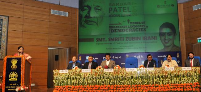 The Union Minister for Textiles and Information & Broadcasting, Smriti Irani delivering the “Sardar Patel Memorial Lecture 2017†on ‘Model of Broadcast Landscape for Democracies’, at a function, in New Delhi on October 26, 2017. The Minister of State for Information & Broadcasting, Col. Rajyavardhan Singh Rathore, the Chairman, Prasar Bharati, Dr. A. Surya Prakash, the Secretary, Ministry of Information and Broadcasting, N.K. Sinha and other dignitaries are also seen.