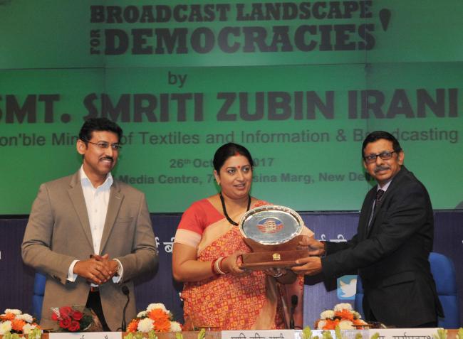 The Union Minister for Textiles and Information & Broadcasting, Smriti Irani being presented a memento by the Chairman, Prasar Bharati, Dr. A. Surya Prakash, at the “Sardar Patel Memorial Lecture 2017†function on ‘Model of Broadcast Landscape for Democracies’, in New Delhi on October 26, 2017. The Minister of State for Information & Broadcasting, Col. Rajyavardhan Singh Rathore is also seen.