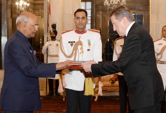 The Ambassador-Designate of the Russian Federation, Mr. Nikolay Rishatovich Kudashev presenting his credentials to the President, Ram Nath Kovind, at Rashtrapati Bhavan, in New Delhi on October 26, 2017.