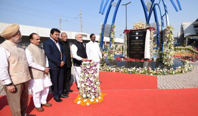 The Prime Minister, Narendra Modi inaugurating Hyderabad Metro, at Hyderabad on November 28, 2017. The Governor of Andhra Pradesh and Telangana, E.S.L. Narasimhan, the Chief Minister of Telangana, Chandrashekar Rao and the Minister of State for Housing and Urban Affairs (I/C), Hardeep Singh Puri are also seen.