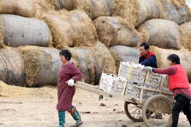 WUHE, May 9, 2019 (Xinhua) -- Deng Wei (C) transports mushroom with other villagers at the mushroom cultivation base in Xinji Village of Wuhe County, east Chinas Anhui Province, May 7, 2019. Deng Wei, 41, and his wife Ou Mingyan, 38, villagers of Xinji Village of Wuhe County, have successfully shaken off poverty after years of hard work by cultivating mushroom (Agaricus bisporus). The family plunged into poverty in 2012 when Deng lost his right arm in a traffic accident during a cargo transportation. Without source of income, Dengs family was registered as a poverty-stricken household in 2014. But Deng and his wife did not give up striving for better life. In 2017, he came back to his hometown to start mushroom cultivation business with the help from the local authority and his friends. He set up a cooperative and the annual output value reached 3 million yuan (442,772 U.S. dollars) after two-year operation. He also helped others by creating job opportunities for over 40 poverty-stricken households from neighboring villages.
