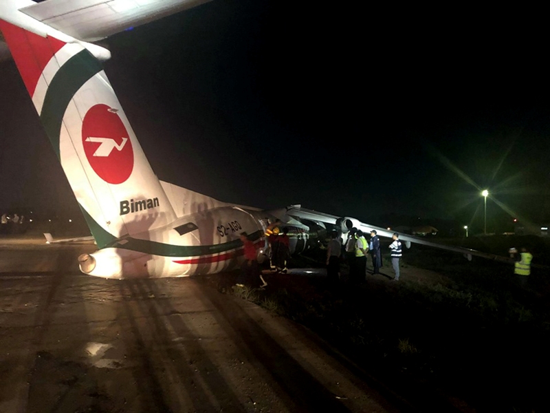 YANGON, MAY 9 (Xinhua) - Photo taken on May 8, 2019 shows the broken passenger plane of the Biman Bangladesh airlines at the Yangon International Airport in Yangon, Myanmar. Some 18 people including five crew members were injured after a passenger plane of the Biman Bangladesh airlines skidded off the runway at Myanmars Yangon International Airport (YIA) on Wednesday, said the Department of Civil Aviation Myanmar.