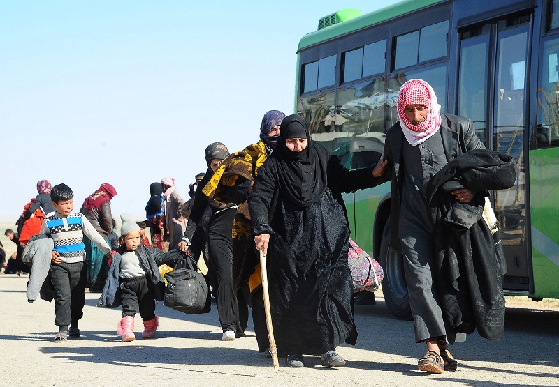 HOMS (SYRIA) MAY 9 (Xinhua)- Syrian refugees are seen at the Jlaighem crossing after they left the Rukban camp, in the eastern countryside of Homs Province, Syria, on May 8, 2019. Batches of Syrian refugees returned from Jordan and the Rukban camp in southern Syria on Wednesday, according to the state news agency SANA.
