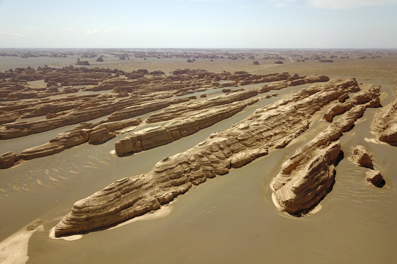 DUNHUANG, MAY 9 (Xinhua) - Aerial photo taken on May 8, 2019 shows the scenery of Dunhuang Yardang National Geopark after a rain in Dunhuang, northwest Chinas Gansu Province.
