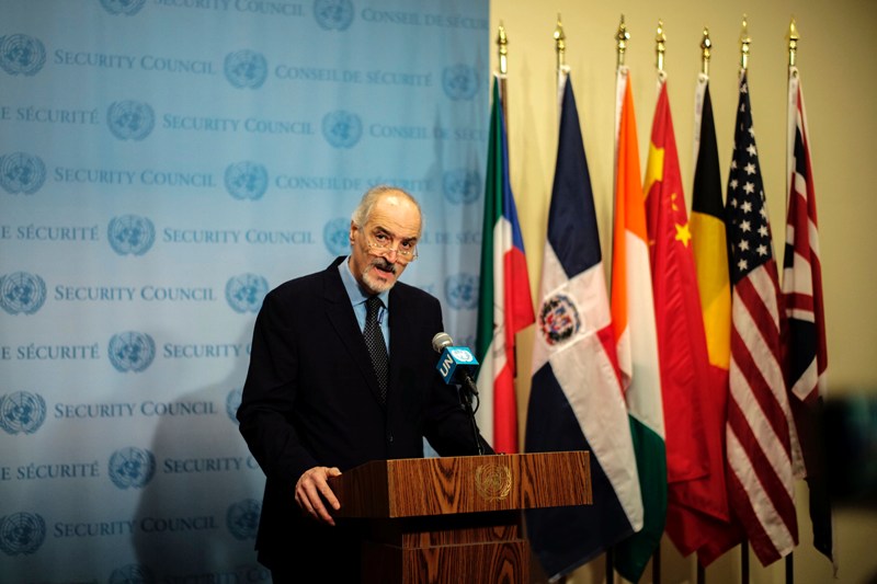 UNITED NATIONS, March 23, (Xinhua) -- Bashar Jaafari, Syrias permanent representative to the United Nations, speaks to journalists at the UN headquarters in New York, March 22, 2019. Bashar Jaafari said Friday that the Syrian Golan will always remain an Arab Syrian territory, reacting to U.S. President Donald Trumps surprise tweet that the United States would recognize Israels sovereignty over the Golan Heights.