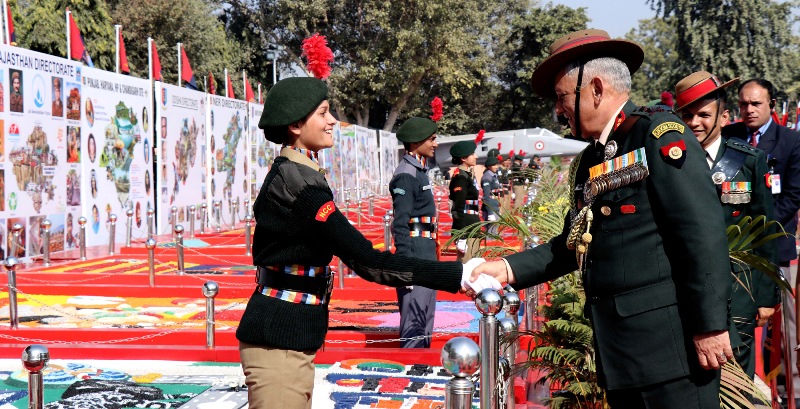 The Chief of Army Staff, General Bipin Rawat interacting with cadets, during his visit to the NCC Republic Day Parade Camp 2018, in New Delhi on January 16, 2018.