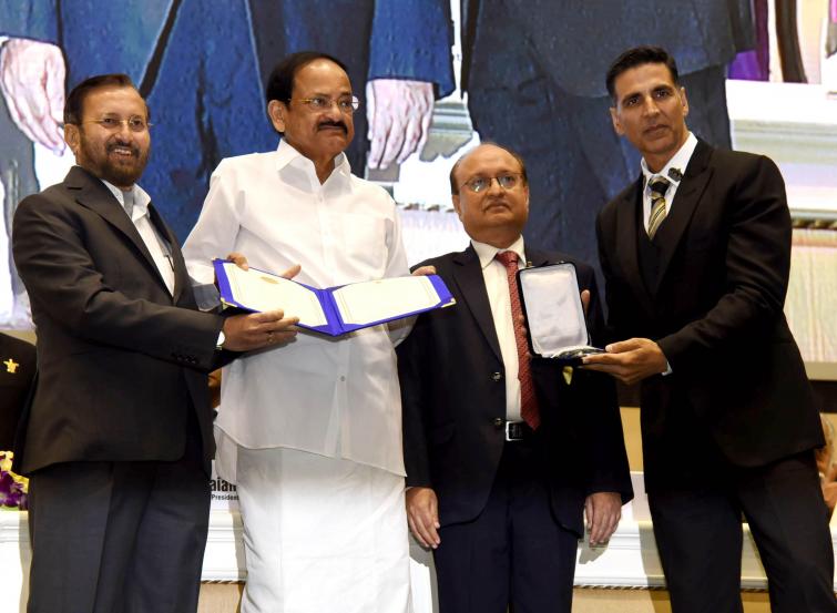 Actor Akshay Kumar received the honour for Best Film on Social Issues, Padman, at the 66th National Film Awards function.
