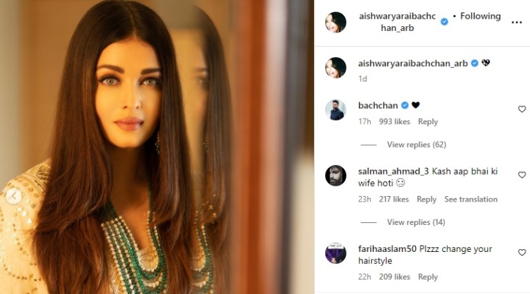 Abhishek Bachchan dropped a heart emoji on his wife Aishwarya's post.