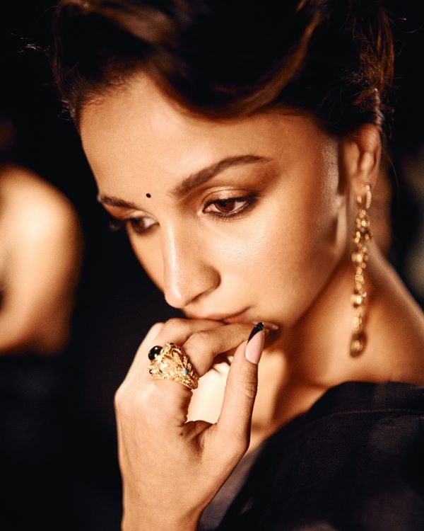 Alia wore a black Murshidabad silk saree with a gorgeous blouse full of precious stones with a plunging neckline for the gala event, which was the destination for several top B-Town celebrities.