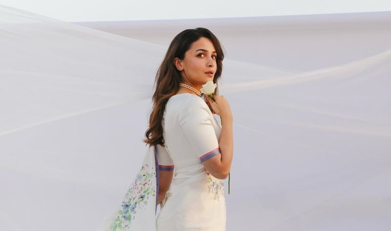 Alia wore a classic white saree with floral prints designed by ace couturier Sabyasachi Mukherjee and a V-neck blouse of the same colour.