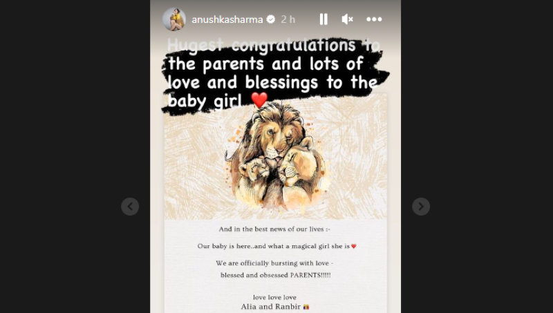 Congratulating the couple, actor Anushka Sharma wrote in an Instagram story, "Hugest congratulations to the parents and lots of love and blessings to the baby girl."