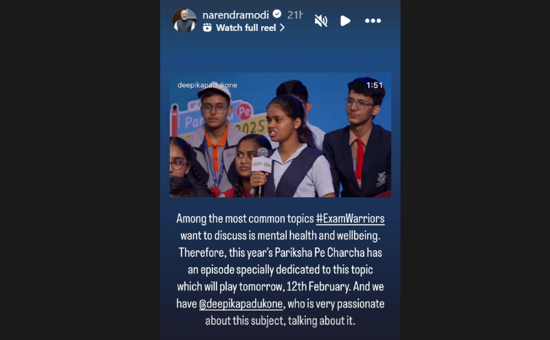 In response, the Prime Minister wrote in an Instagram story, "Among the most common topics #ExamWarriors want to discuss is mental health and wellbeing. Therefore, this year's Pariksha Pe Charcha has an episode specially dedicated to this topic which will play tomorrow, 12th February. And we have Deepika Padukone, who is very passionate about this subject, talking about it."