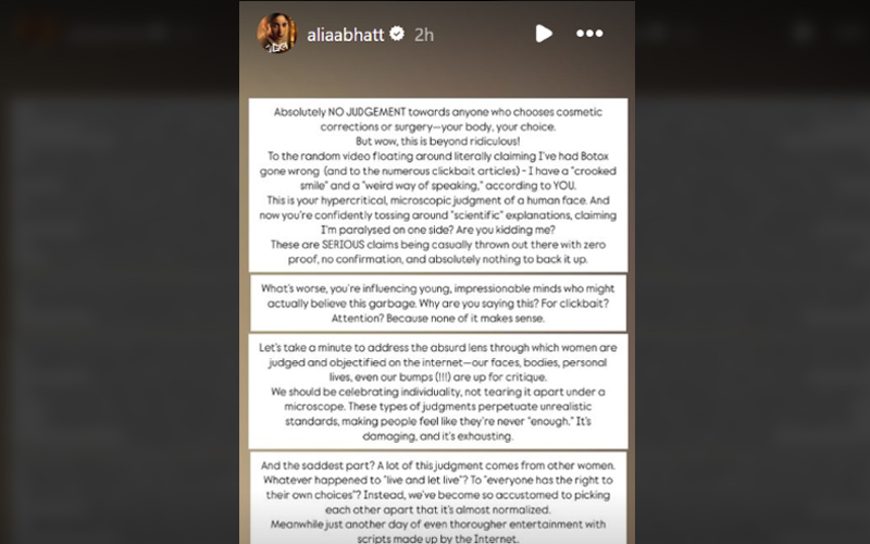 Alia shared a long note on her Instagram story hitting out at the videos and articles that claim her expressions suggest botox going wrong.