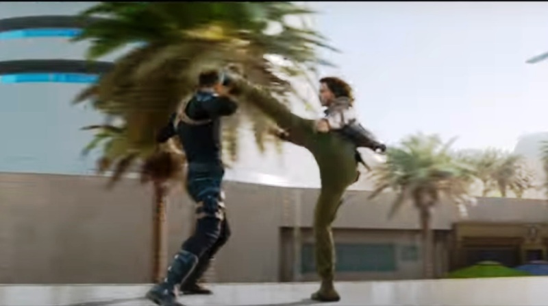 The scene in question starts with a high-speed car chase, where Jim stands in the middle of the road and targets Pathaan's vehicle. It is followed by their fight atop a speeding truck as two helicopters hover over them.