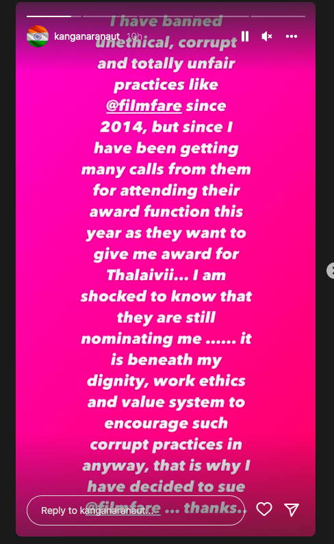 “I've banned unethical, corrupt and totally unfair practices like @filmfare since 2014, but since I have been getting many calls from them for attending their award function this year as they want to give me award for Thalaivii... I am shocked to know that they are still nominating me. It is beneath my dignity, work ethics and value system to encourage such corrupt practices in anyway, that is why I have decided to sue @filmfare ... thanks,” she posted.
