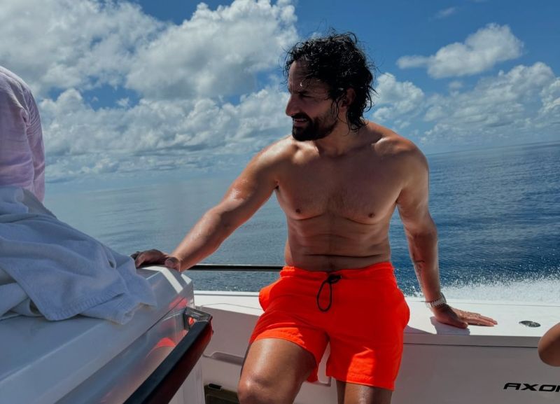 In one of the images, Saif could be seen sporting an orange shorts and sitting at the edge of a boat.