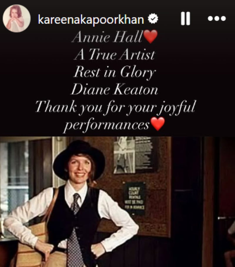 Kareena Kapoor Khan remembered Hollywood star Diane Keaton, who died in her California house, leaving her fans and fraternity members shocked.