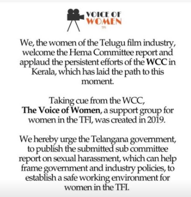 "We hereby urge the Telangana government, to publish the submitted sub committee report on sexual harassment, which can help frame government and industry policies, to establish a safe working environment for women in the TFI (Telugu Film Industry)," the actor wrote.