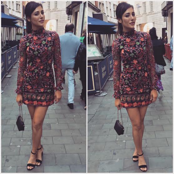 At the Top Shop show, she went for a top to toe chic Topshop look: a beautiful fully embroidered mini dress, which she teamed with a black ankle straps and a matching bag. She chose the embroidered dress because the work on it reminded her of some of her looks in Rockstar which included some beautiful Kashmiri ensembles.
