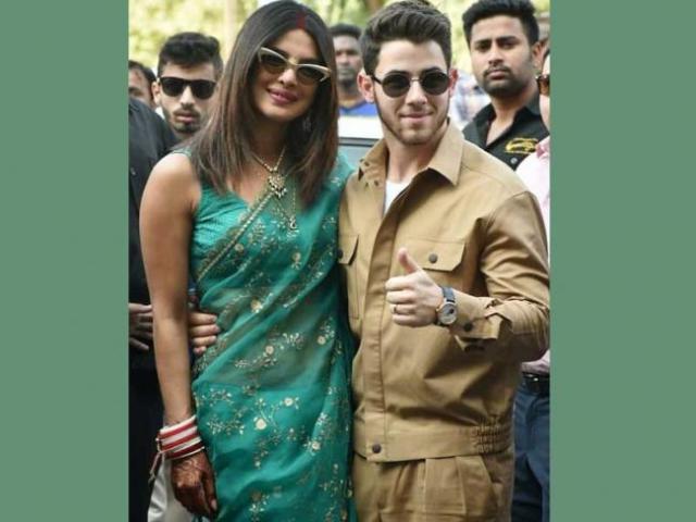 With a pair of cat-eye sunglass perfectly suiting her new-bride look, Priyanka looked stunning as she sported a cyan saree. Nick joined her in safari jacket-and-pant combo.