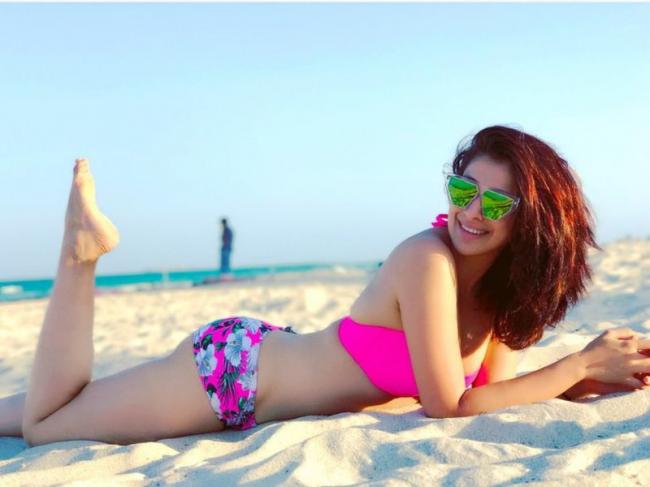 Raai has shared a picture on Twitter where the actress was seen lying on a beach, wearing a pink bikini.