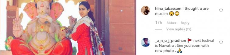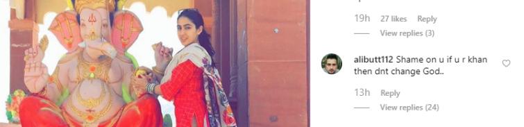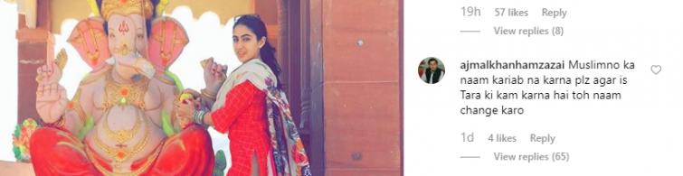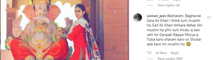 usman_jees said, "Besharam, Baghairat. Sara Ali Khan I think tum muslim ho Saif Ali Khan tmhare father bhi muslim he phir tum hindu q ban rahi ho Ganpati Bappa Morya q Tuba karo sharam karo or Shukar ada karo tm muslim ho 😕 (Shameless. Why are you trying to become a Hindu when your father is a Muslim. You should be ashamed)."