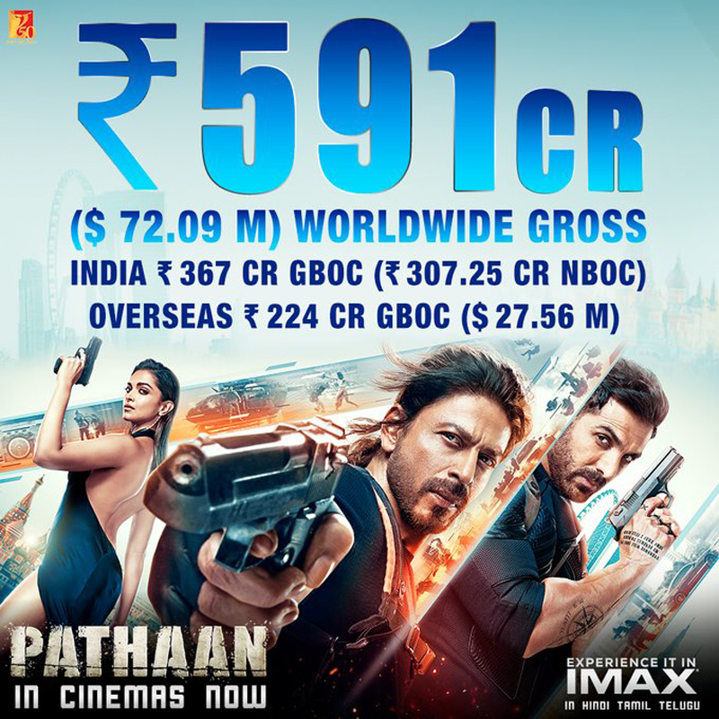 Mumbai: Yash Raj Films’ (YRF) ‘Pathaan’, directed by Siddharth Anand, is on a record-breaking run at the domestic and overseas box office as it collected Rs 591 crore gross worldwide in just six days!