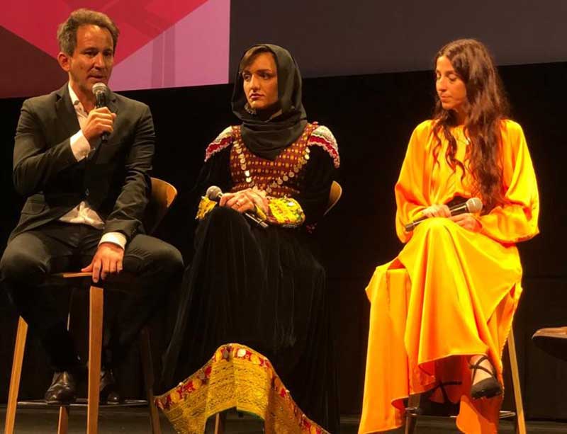 Image credit: TIFF Zarifa Ghafari (middle) and Tamana Ayazi (right) in the press conference