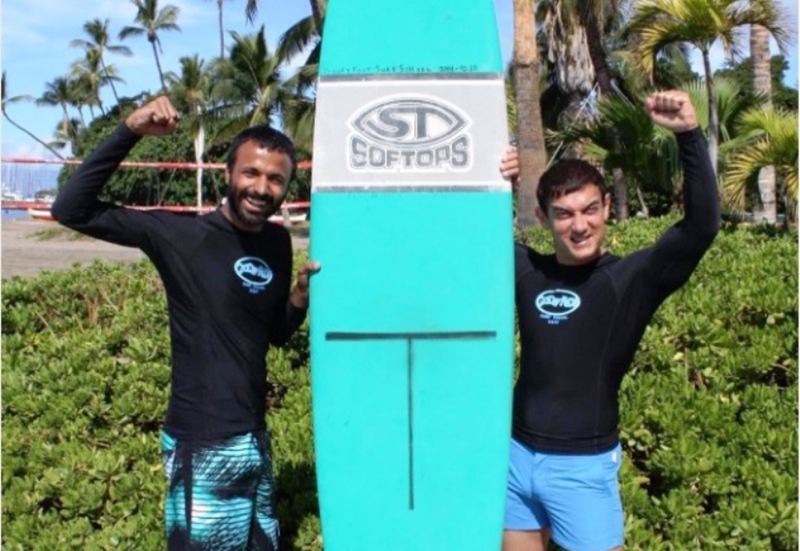 The image seems to be from their vacation as Advait and Aamir can be seen in beach outfits and holding a surfer board.