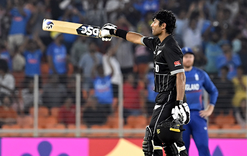 New Zealand batter Rachin Ravindra celebrate his century against England | Photo courtesy: UNI