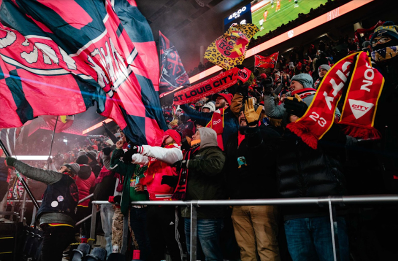 Fans cheer on St. Louis City SC at CityPark in St. Louis, MO. as they play the San Jose Earthquakes on Mar. 18, 2023.