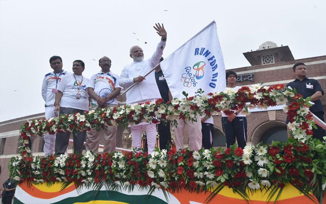 New Delhi, July 31 (IBNS): Prime Minister Narendra Modi here flagged off the Run For Rio from Major Dhyan Chand National Stadium(MDCNS), India Gate to Jawaharlal Nehru Stadium (JNS), Lodhi Road amidst Olympic spirit and cheers to celebrate the Olympic mood in the country.