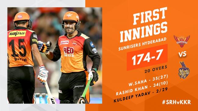 SunRisers Hyderabad score 174 for 7 in their innings against KKR