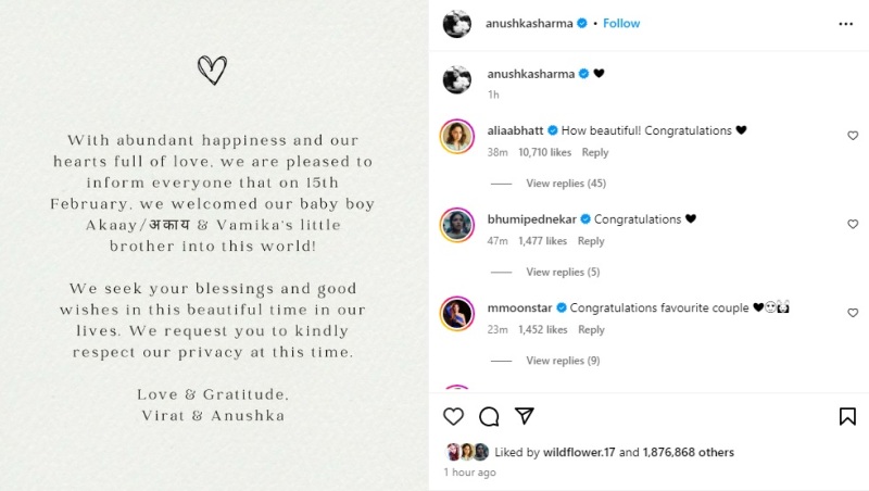 “With abundant happiness and our hearts full of love, we are pleased to inform everyone that on 15th February, we welcomed our baby boy Akaay and Vamika’s little brother into this world! We seek your blessings and good wishes in this beautiful time in our lives. We request you to kindly respect our privacy at this time," read the post.