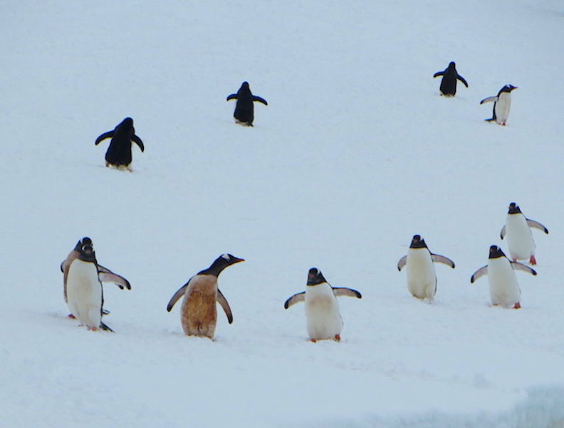 The penguins mostly minded their own business, sometimes wobbling like little people, sometimes crawling, sometimes simply resting. A curious few advanced near enough to check us out. We saw Adelies with fully black heads, the Gentoos with white stripes on the top of their heads, the Chinstraps with the black stripes below the beaks and the occasional Macaronies with their yellow crest feathers.