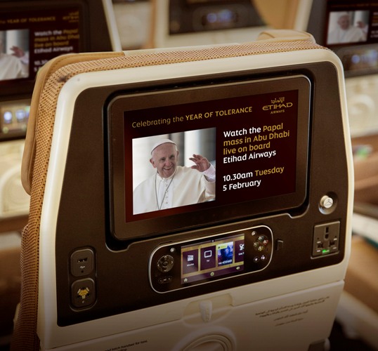 The papal mass will also be available to watch on board Etihad Airways aircraft through a live broadcast of this historic event on inflight entertainment screens and at the airline’s lounges worldwide. The live screening will also be available for Etihad employees to enjoy in selected locations throughout the company’s offices.