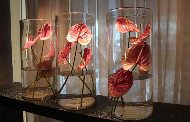 In one cylindrical vase four pink anthurium are placed in  a manner that you feel the essence of close friends enjoying their closeness in a late night party.