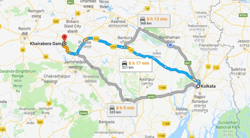 Roads i) Via NH16 and SH 5 ii) Via NH19 and Durgapur-Purulia-Raghunathpur Road iii) Via SH2 (average 7 hours 25 mins)