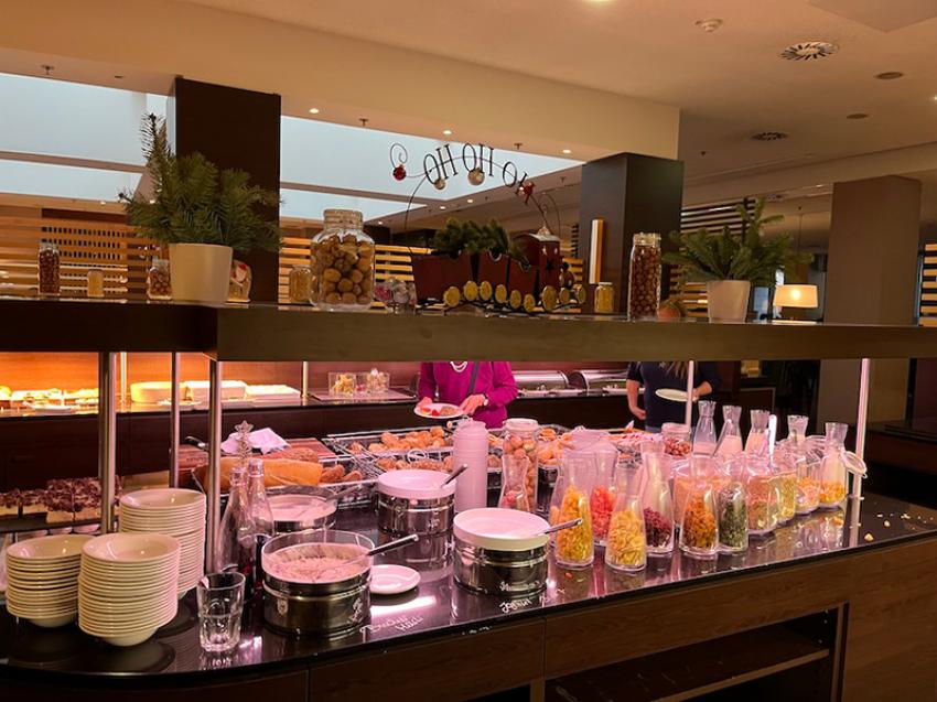 The buffet breakfast is delicious at the hotel with a lot of dishes to choose from.