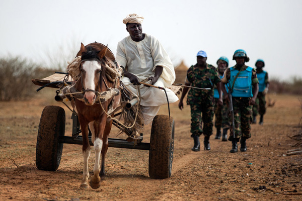 A farmer in Karbab, South Darfur, rides his cart while Tanzanian troops from the African Union-UN Hybrid Operation in Darfur (UNAMID) arrive at the village as part of a routine patrol. UN Photo/Albert González Farran