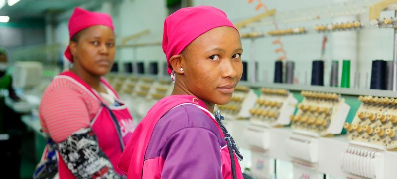 Garment workers stand next to a line of sewing machines in a clothing plant in Lesotho.Photo Courtesy: ILO/Marcel Crozet