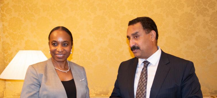 Dr. Hashim Hussein, Head of UNIDO Investment Promotion Office and the Managing Director, Policy and Programme Support of UNIDO, Fatou Haidara during a meeting on the sidelines of the Global Forum for Entrepreneurs and Investment