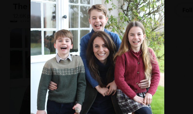 She shared a photo, clicked by her husband Prince William, the heir to the throne, looking cheerful and in good health with her three children—Princes George and Louis and Princess Charlotte.