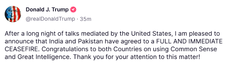 Pakistani Foreign Minister confirmed the development and wrote on X: " Pakistan and India have agreed to a ceasefire with immediate effect. Pakistan has always strived for peace and security in the region, without compromising on its sovereignty and territorial integrity!"