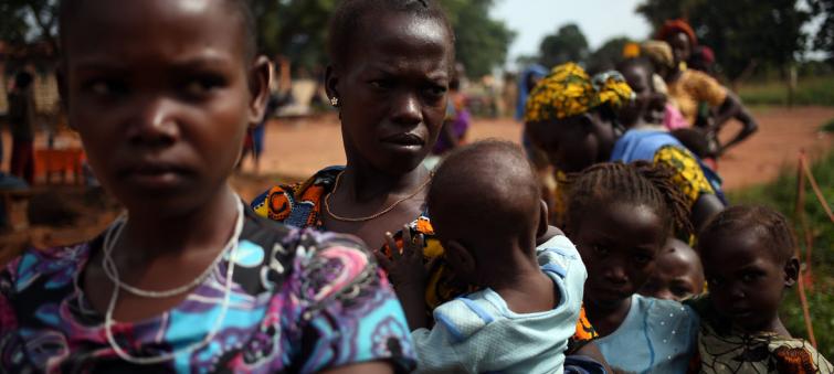 Women who fled violence and in the Central African Republic queue with their children to receive treatment at a UNICEF-supported clinic.